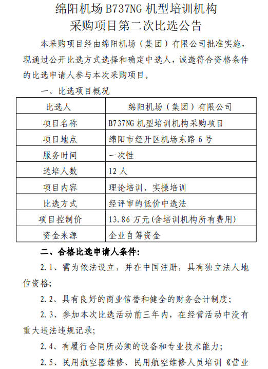 綿陽(yáng)機(jī)場(chǎng)B737NG機(jī)型培訓(xùn)機(jī)構(gòu)采購(gòu)項(xiàng)目第二次比選公告